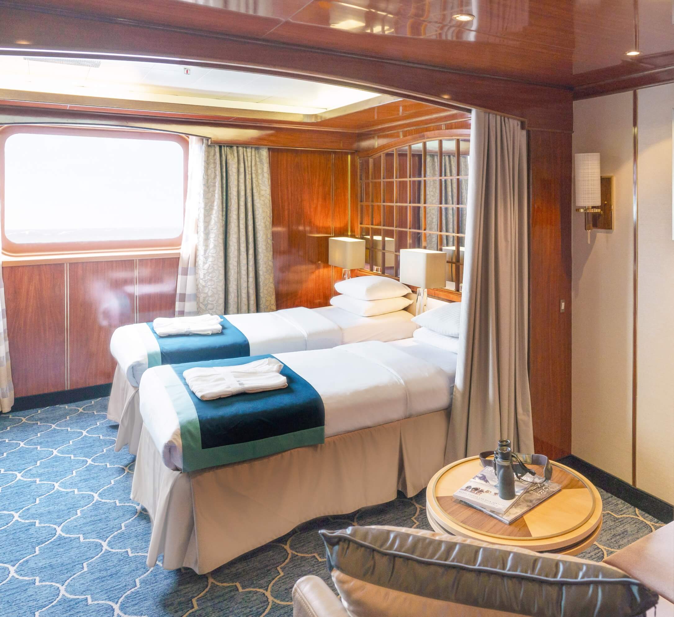 Features all - suite accommodations. Each spacious, every cabin's well-appointed location across the decks provides a generous measure of comfort.