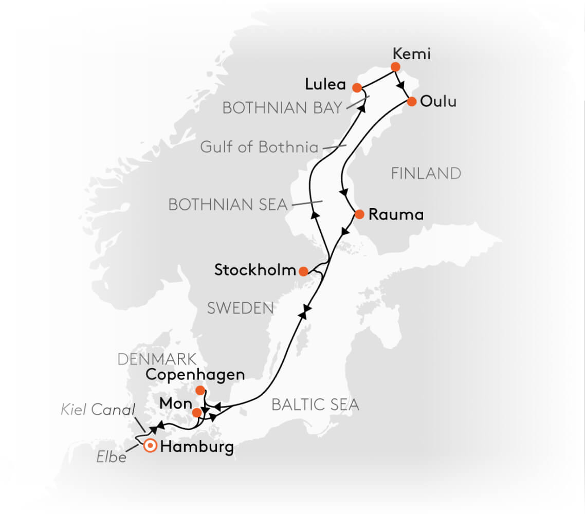 A roudtrip from Hamburg, Germany onboard a luxury German expedition ship, that takes you across Sweden, Denmark and Finland at the time of the year, where no other cruise ships sail in the region! Enjoy a classic Swedish and Finnish winter adventure inclusive of landings, and zodiac rides, to special settlements, and some extremely high chances of sighting the northern lights under the Scandinavian sky!